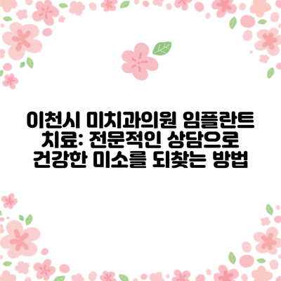 임플란트 치료는 고비용과 시간 소요가 있지만, 미래의 치아 건강을 위해 꼭 필요한 과정이에요. 이천시 미치과의원은 신뢰할 수 있는 전문가들과 최신 장비를 갖추고 있어 많은 환자들에게 만족스러운 결과를 제공하고 있답니다. 전문적인 상담을 통해 건강한 미소를 되찾는 기회를 누리세요!